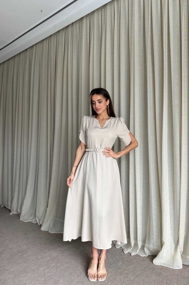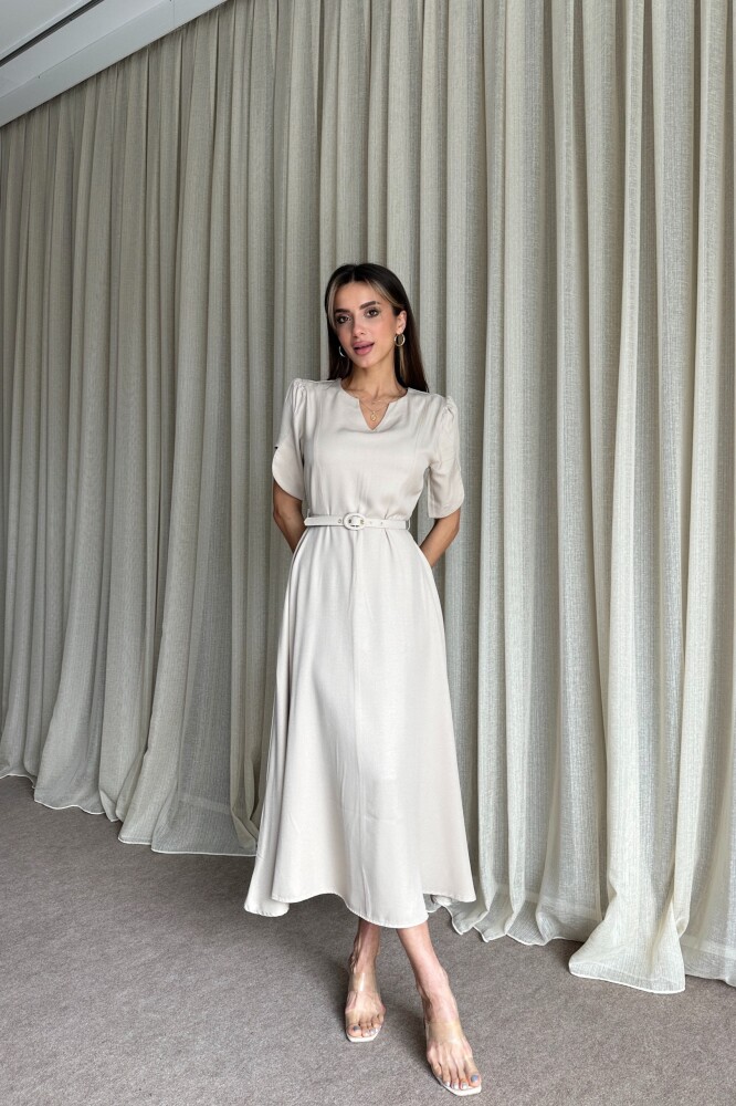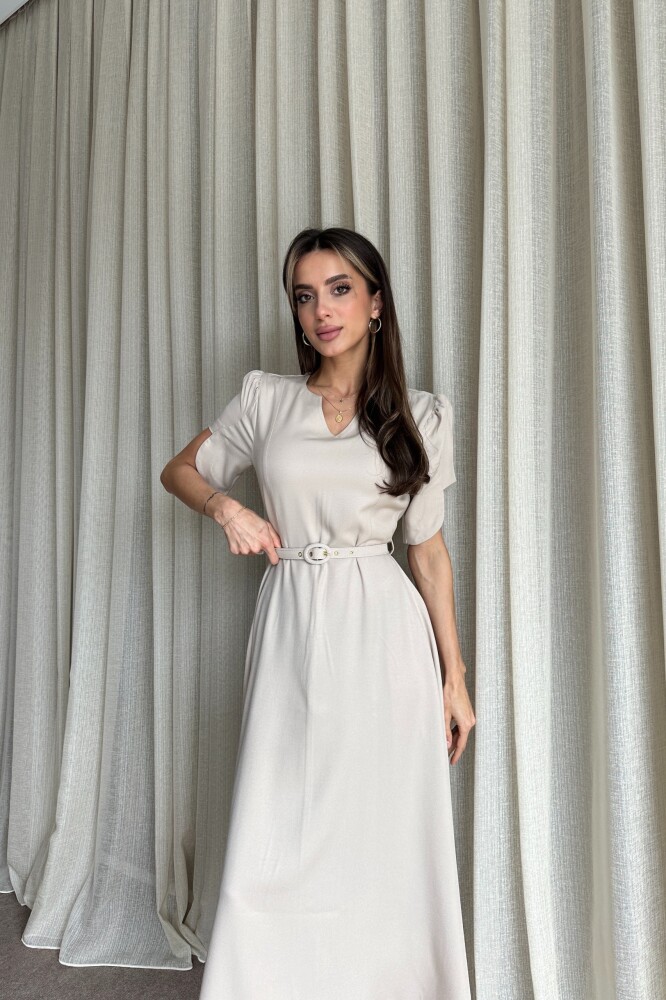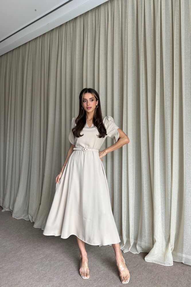 Balon Kol Kemerli Uzun Elbise - Bej