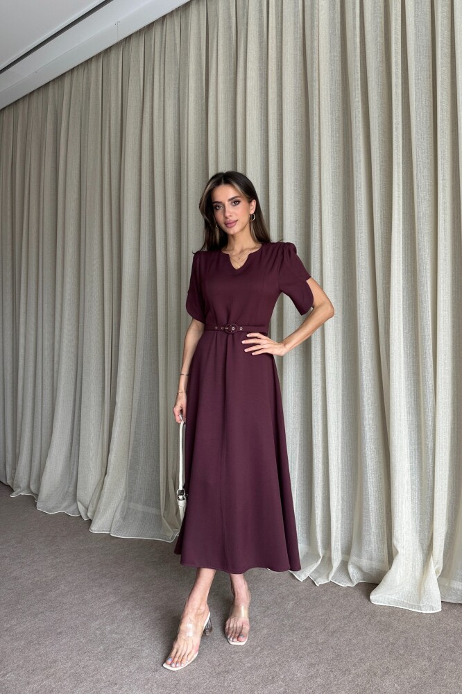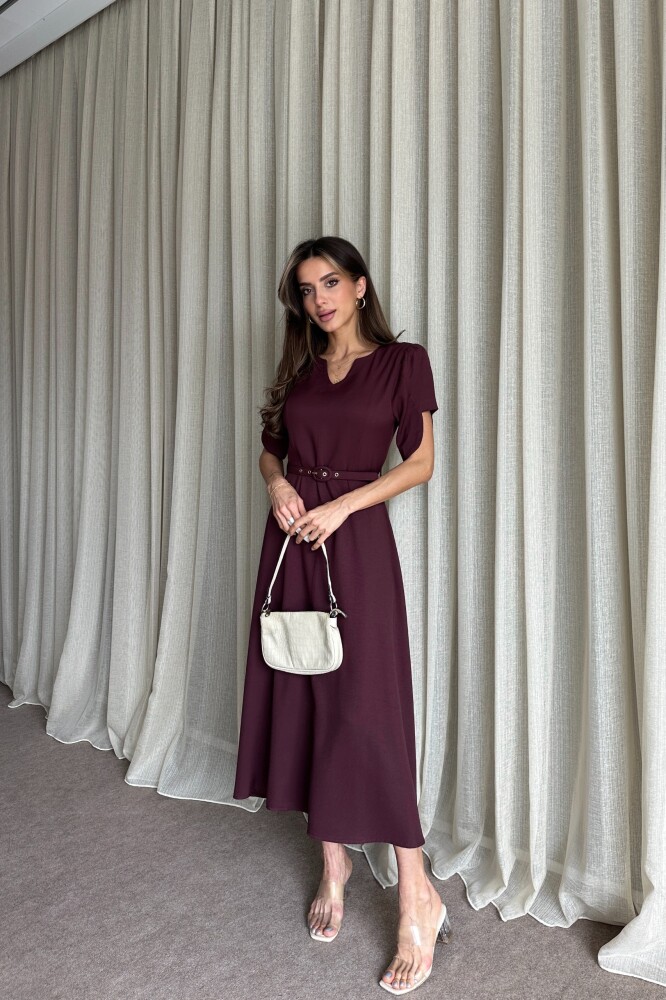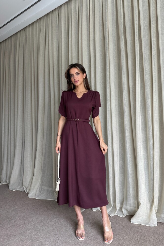 Balon Kol Kemerli Uzun Elbise - Mürdüm