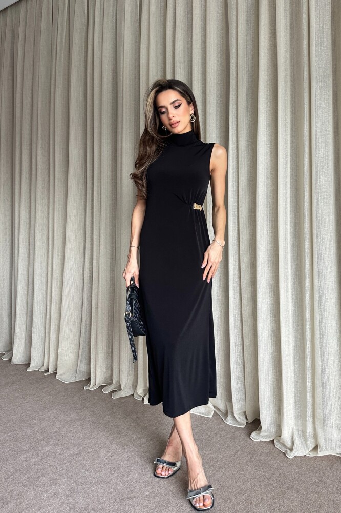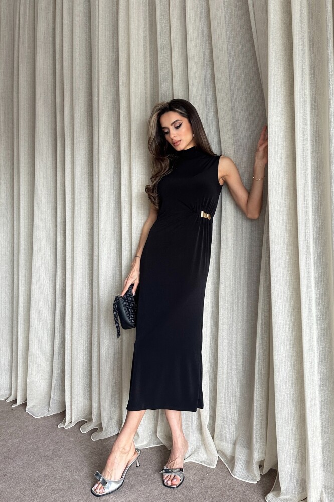 Boğazlı Yanı Büzgülü Toka Detaylı Elbise - Siyah