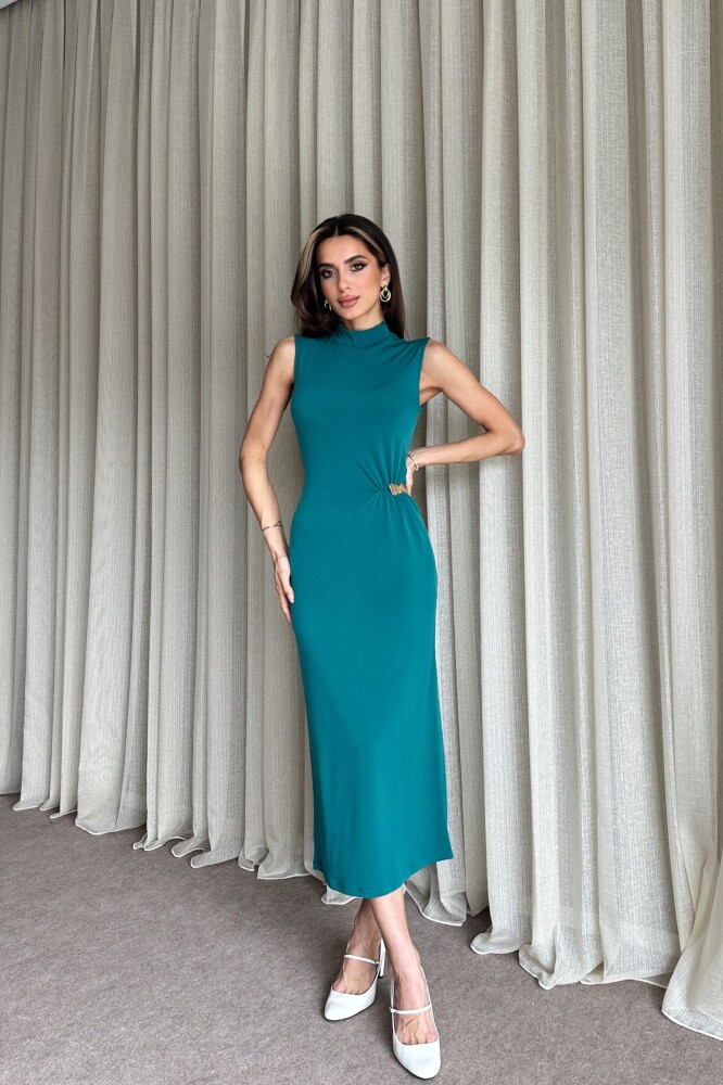 Boğazlı, kolsuz, yanı büzgülü, toka detaylı.