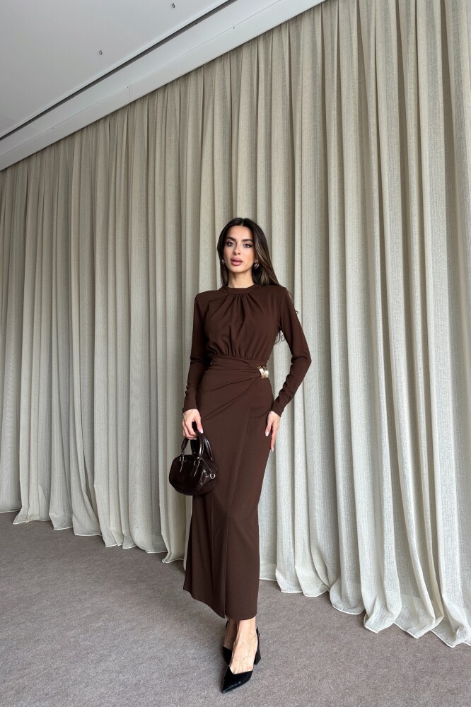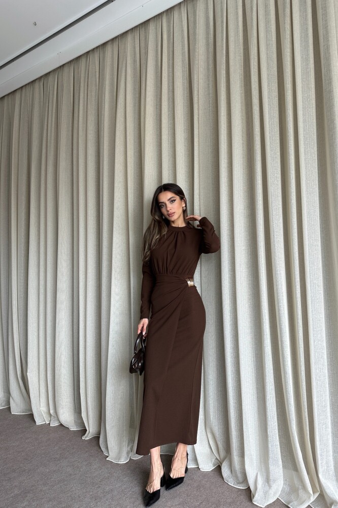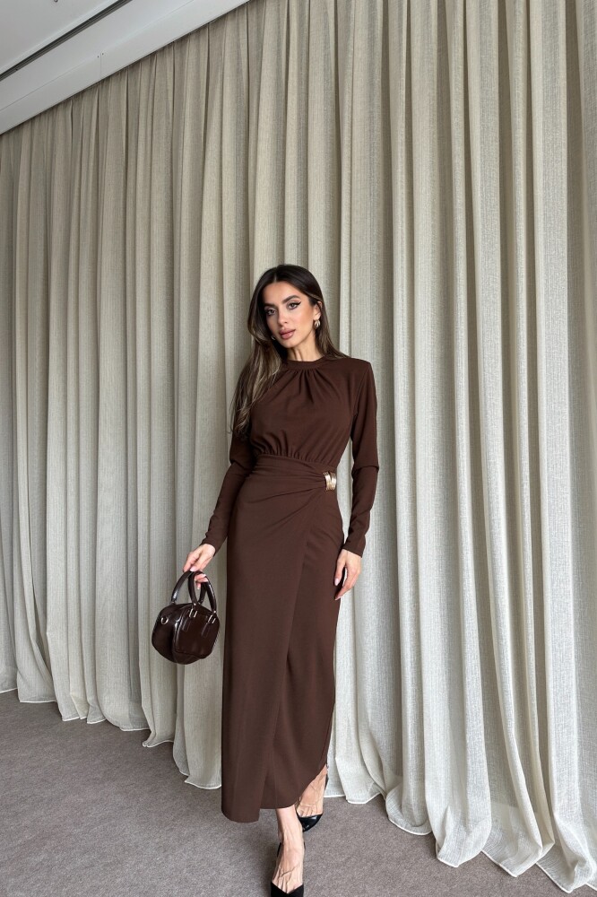 Büzgülü Toka Detaylı Kruvaze Kapamalı Uzun Elbise - Kahve