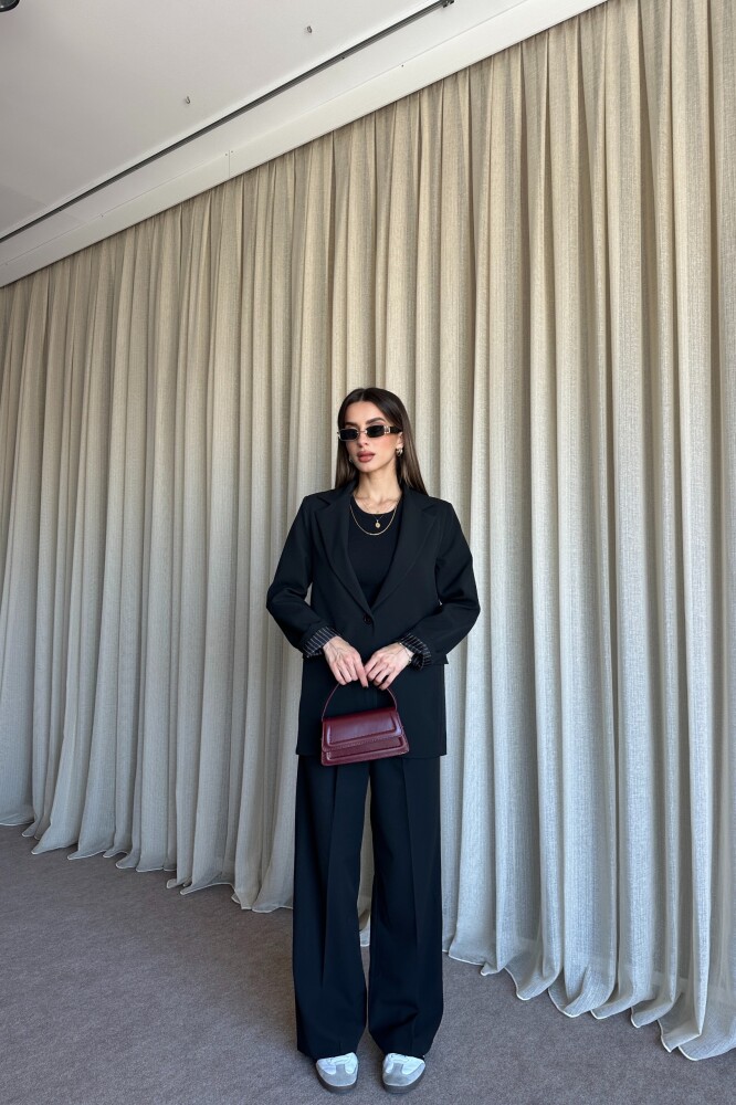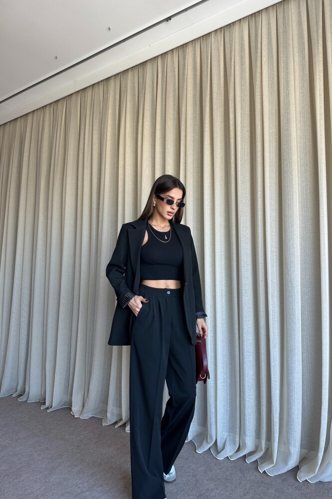 Düğmeli Blazer Ceket Palazzo Pantolon Takım - Siyah