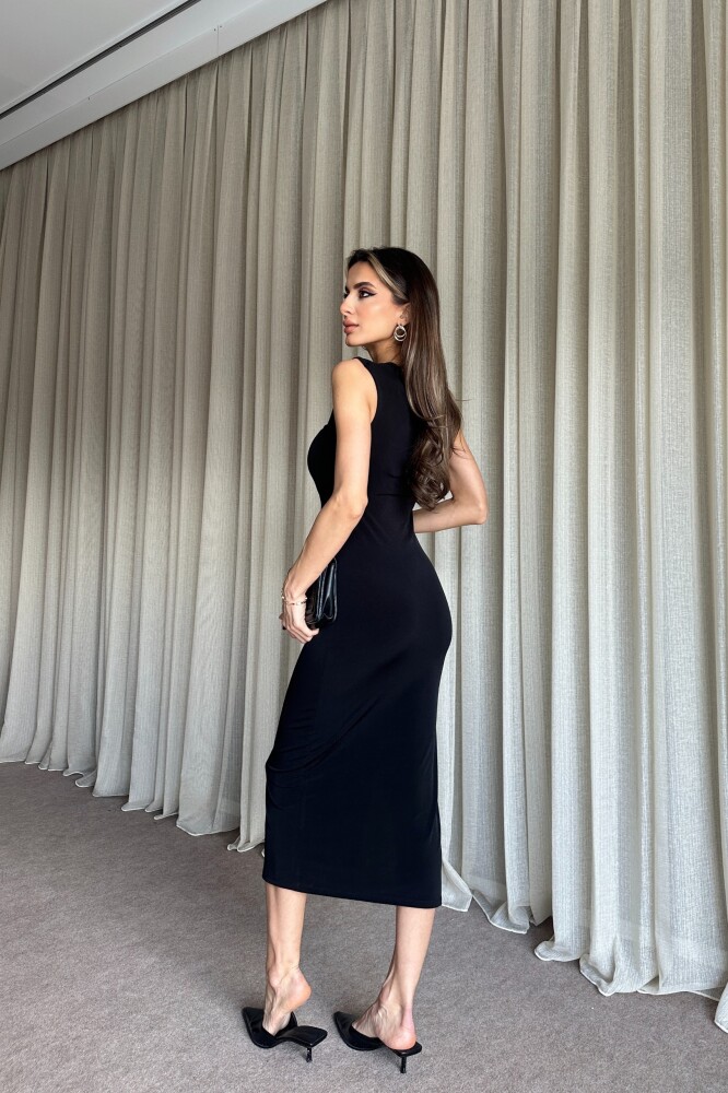 Kare Yaka Yanı Büzgülü Yırtmaçlı Elbise - Siyah