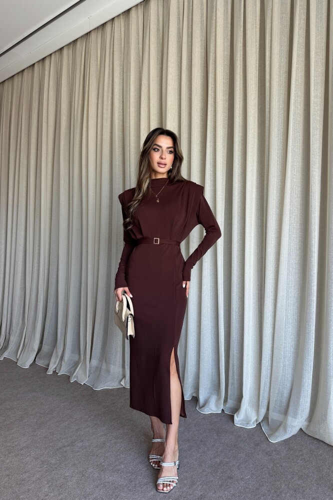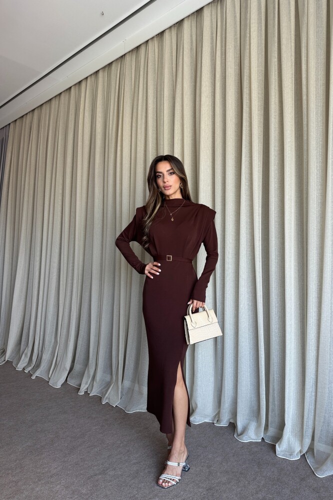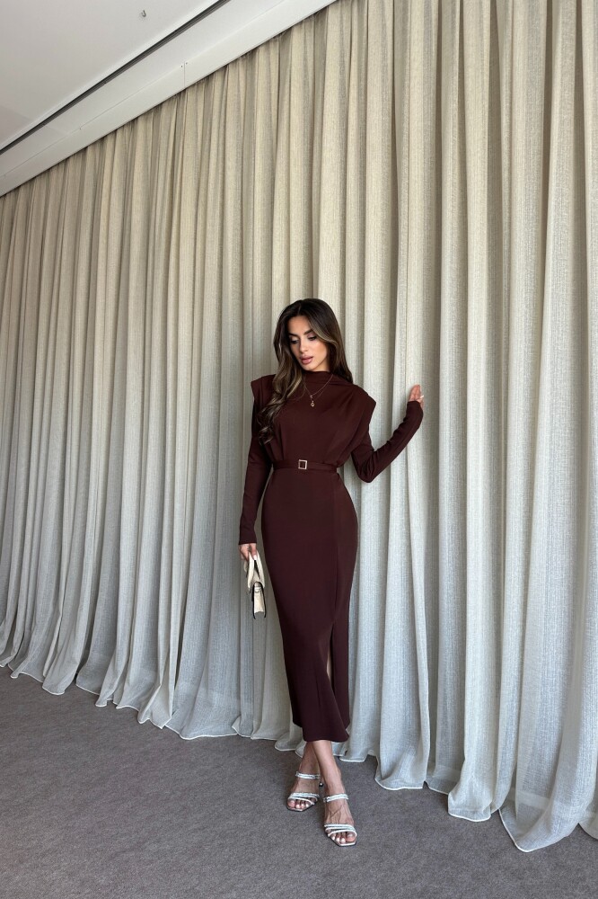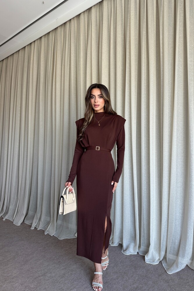 Omuz Vatkalı Kemerli Yırtmaçlı Uzun Elbise - Kahve