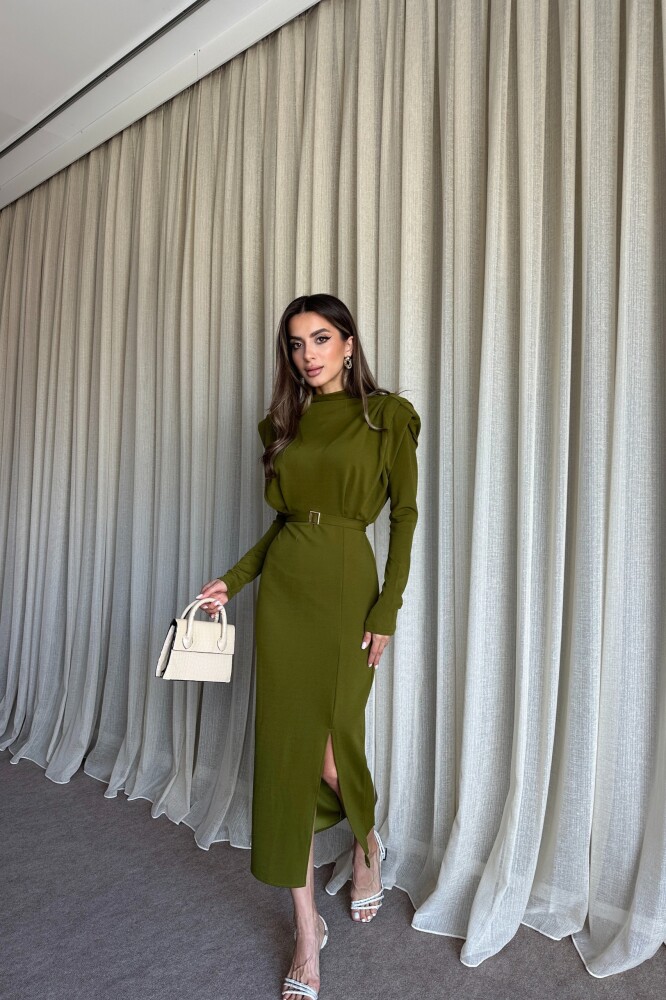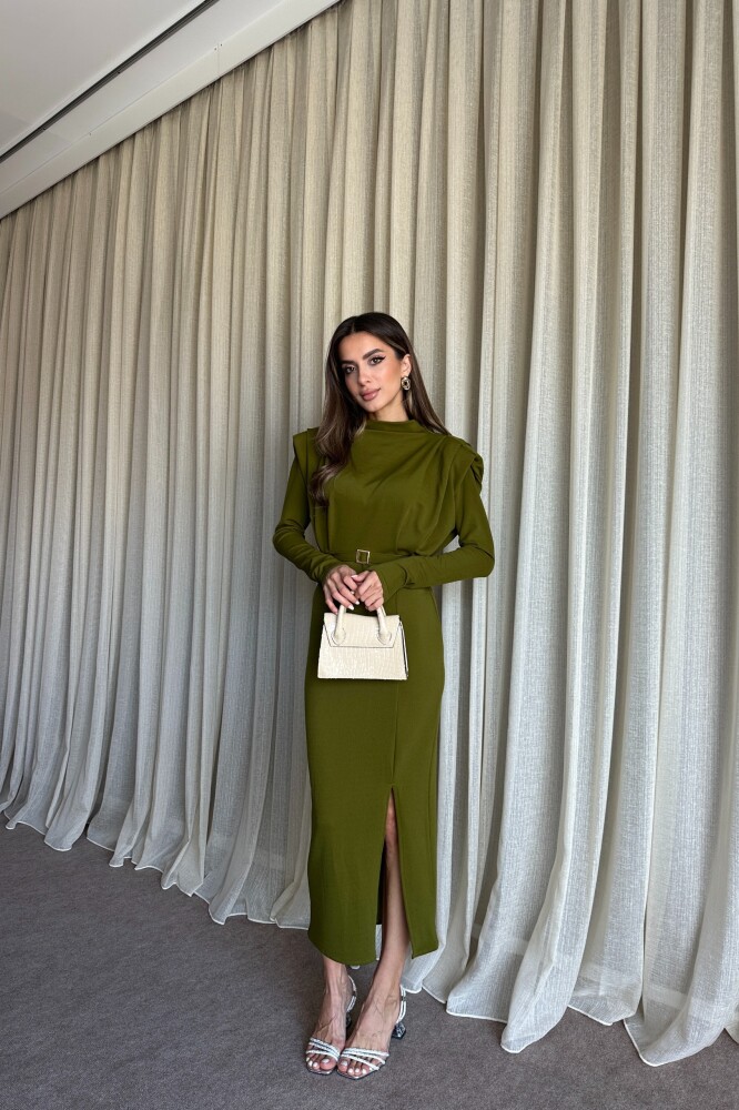 Omuz Vatkalı Kemerli Yırtmaçlı Uzun Elbise - Olive