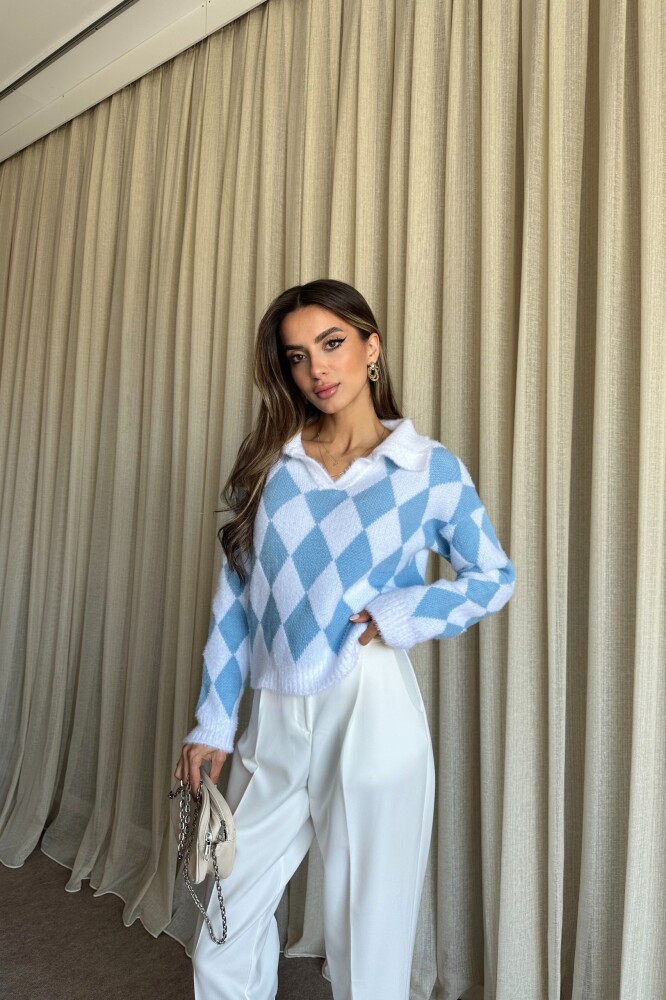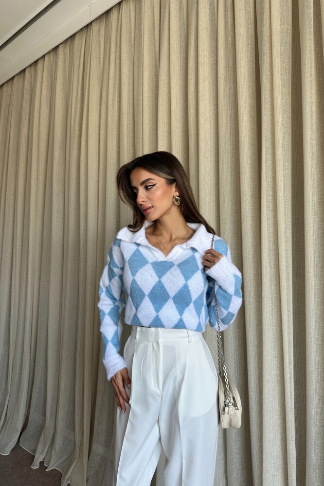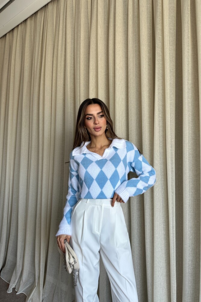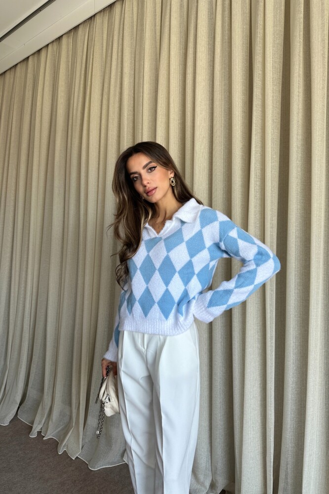 Polo Yaka Baklava Desenli Triko Kazak - Mavi