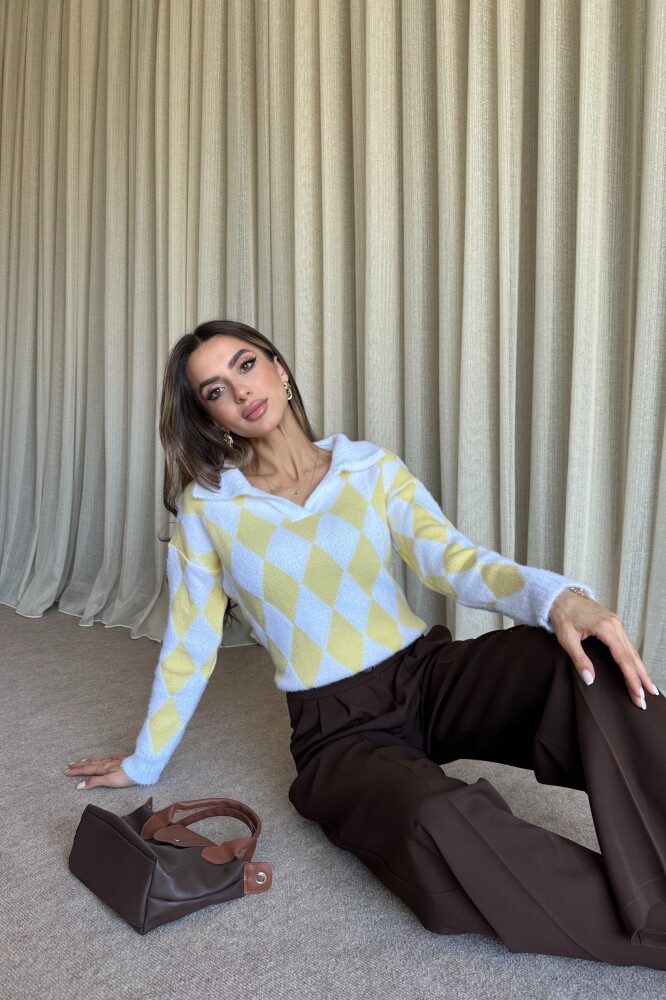 Polo yaka, baklava desenli, triko.