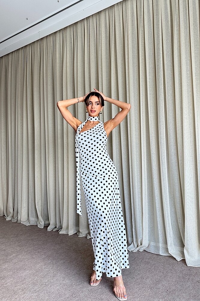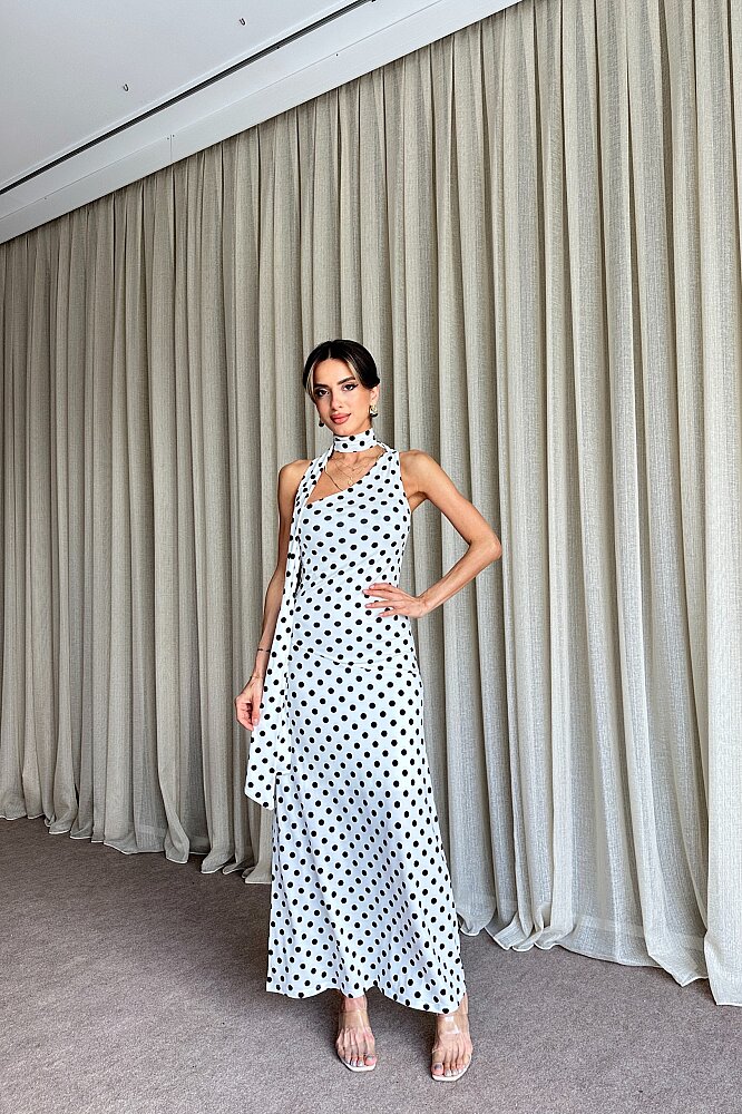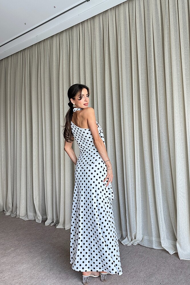 Puantiyeli Tek Omuz Fular Detaylı Elbise - Beyaz