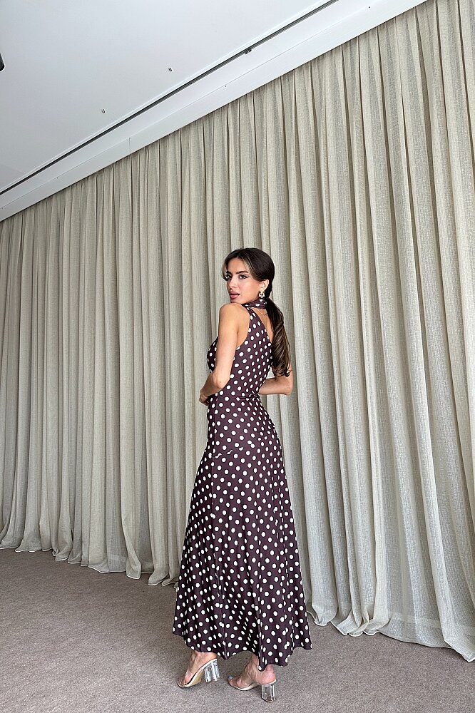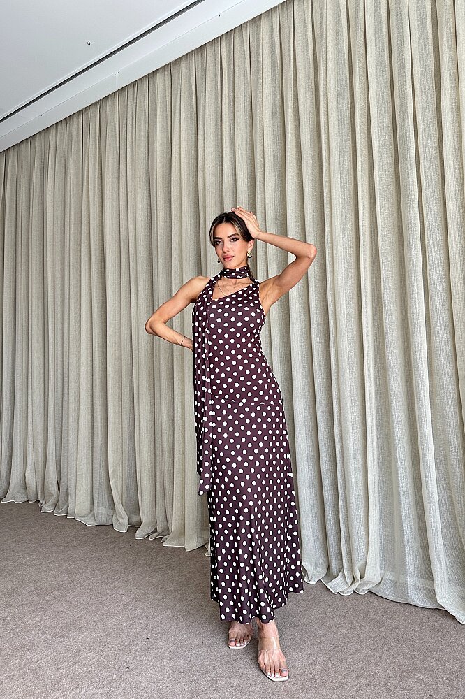 Puantiyeli Tek Omuz Fular Detaylı Elbise - Kahve