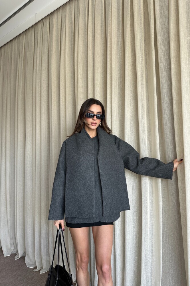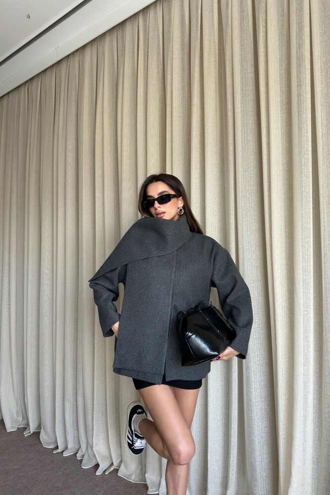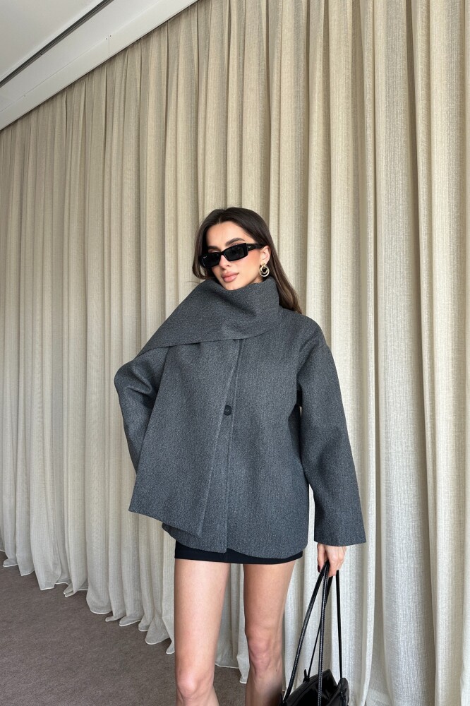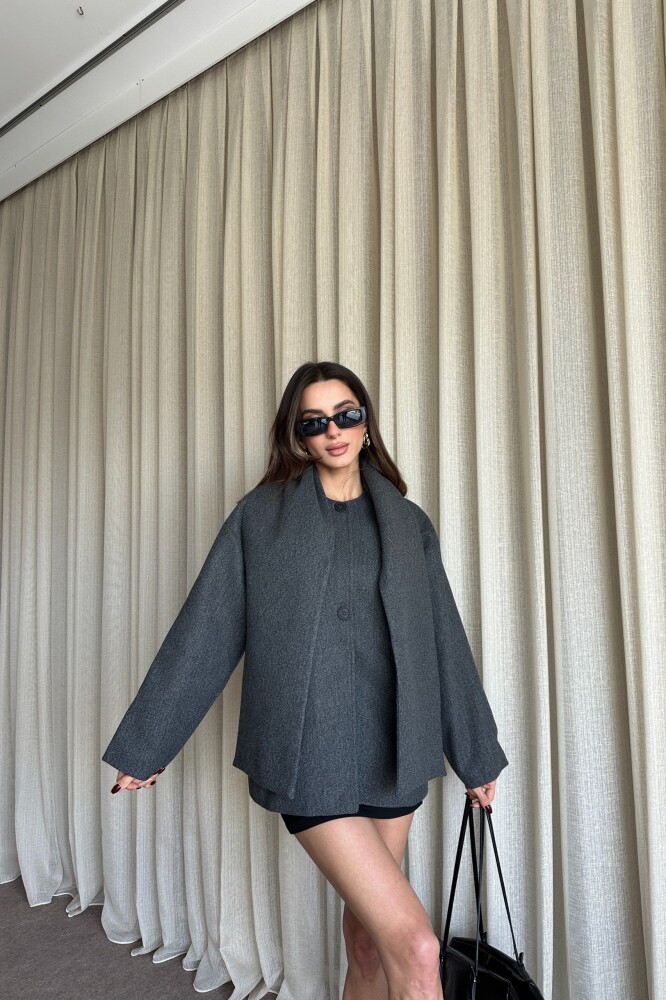 Şal Detaylı Astarlı Kaşe Kaban - Antrasit