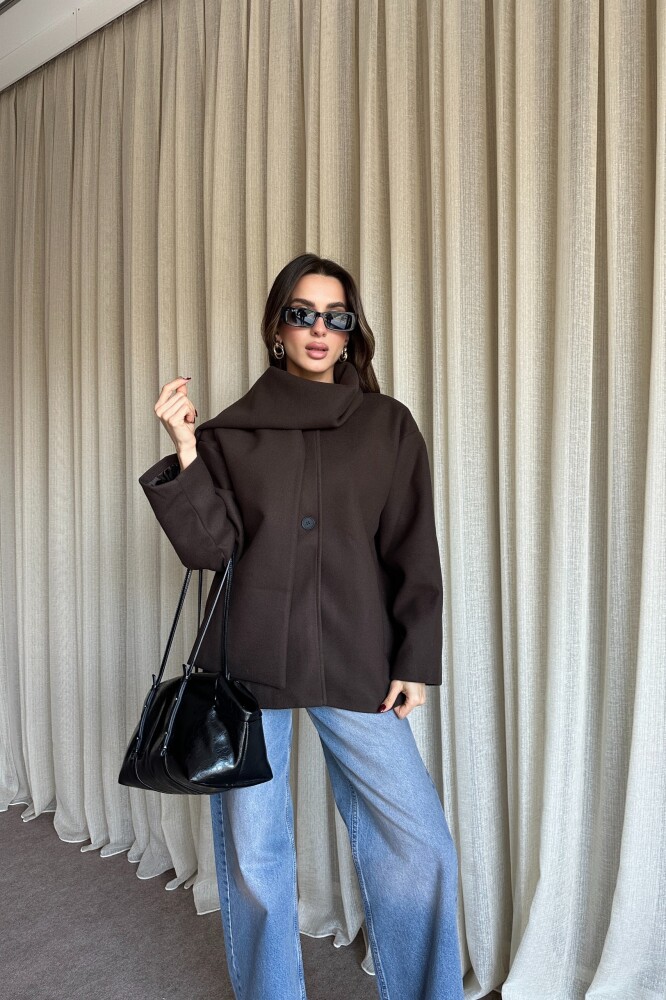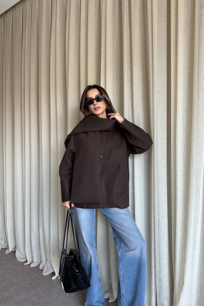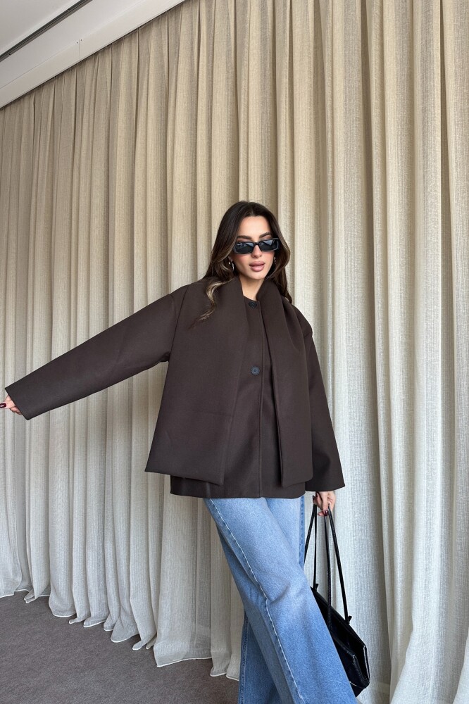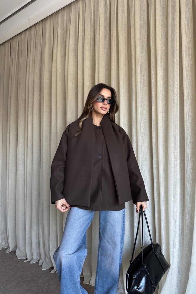 Şal Detaylı Astarlı Kaşe Kaban - Kahve