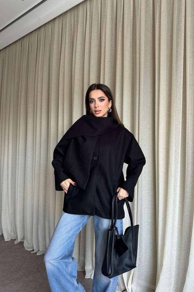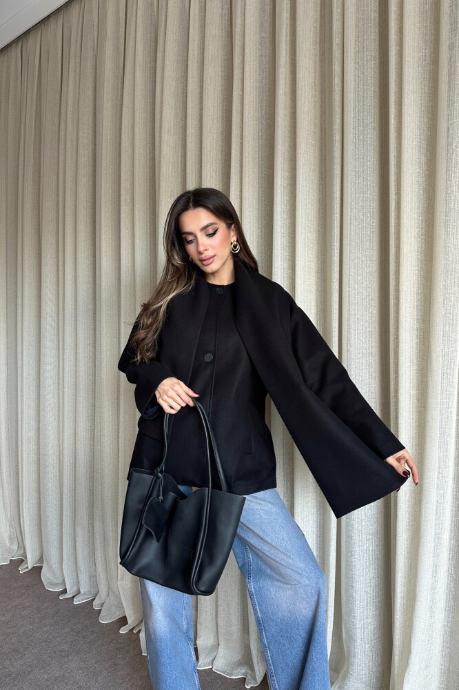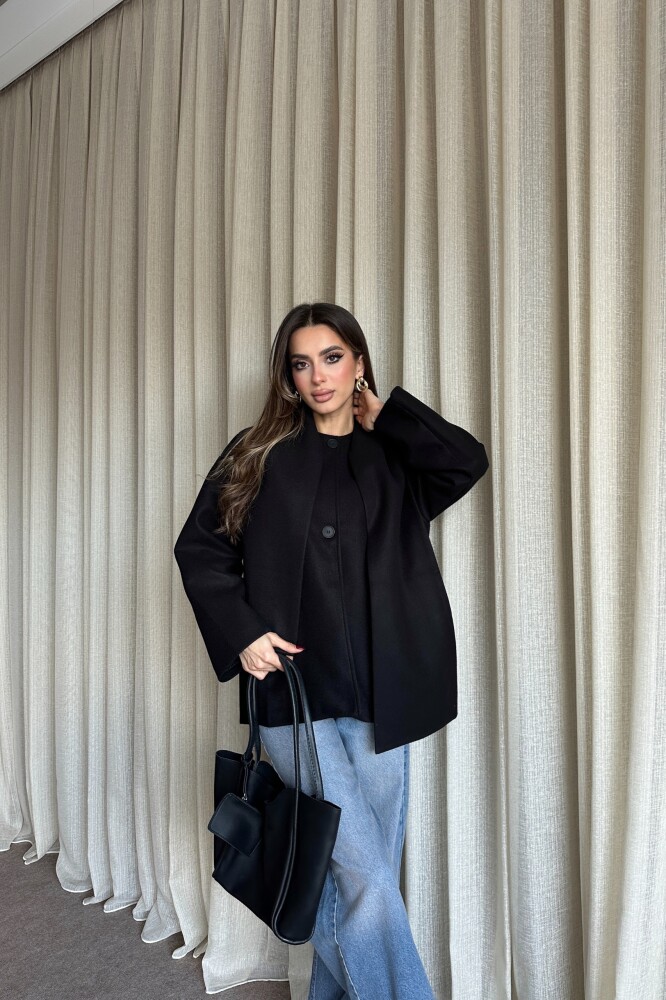 Şal Detaylı Astarlı Kaşe Kaban - Siyah