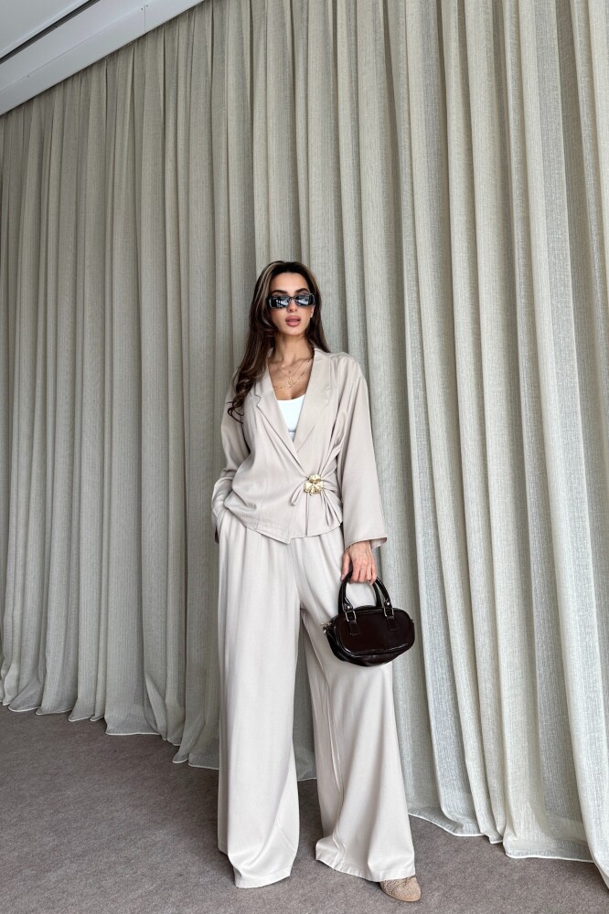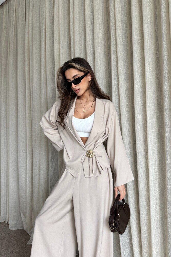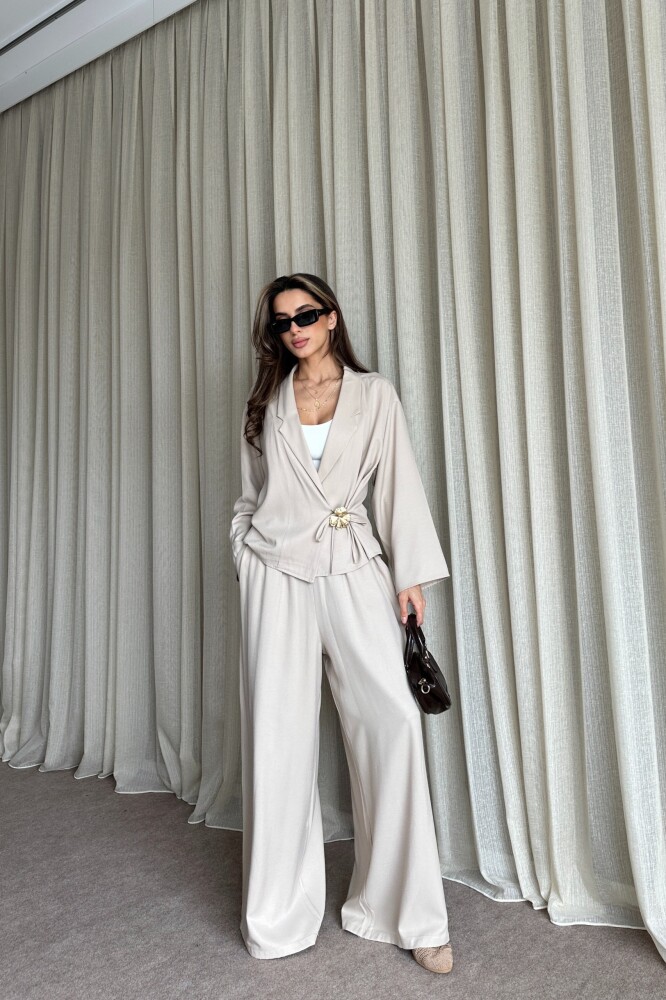 Toka Detaylı Yandan Bağlamalı Salaş Takım - Bej