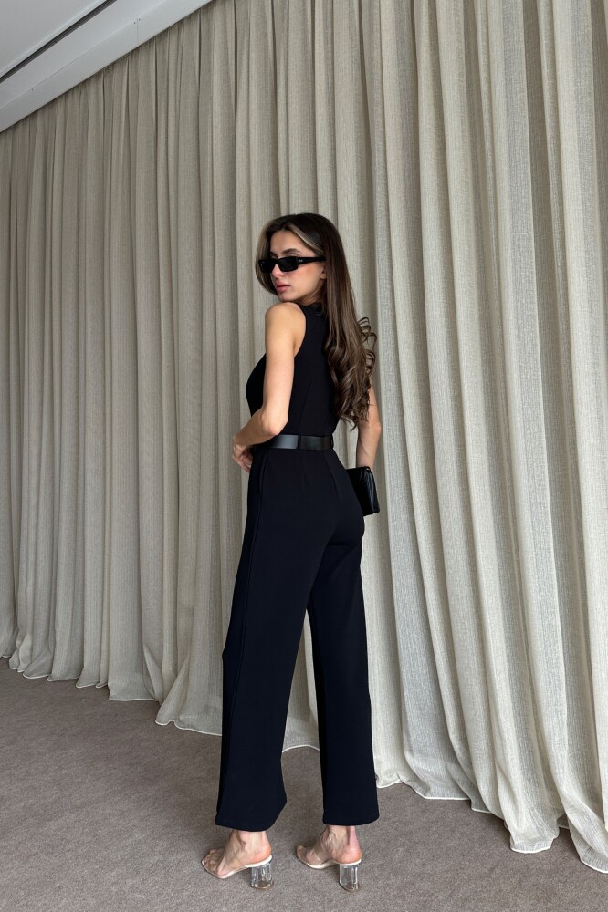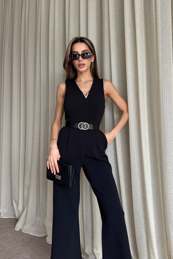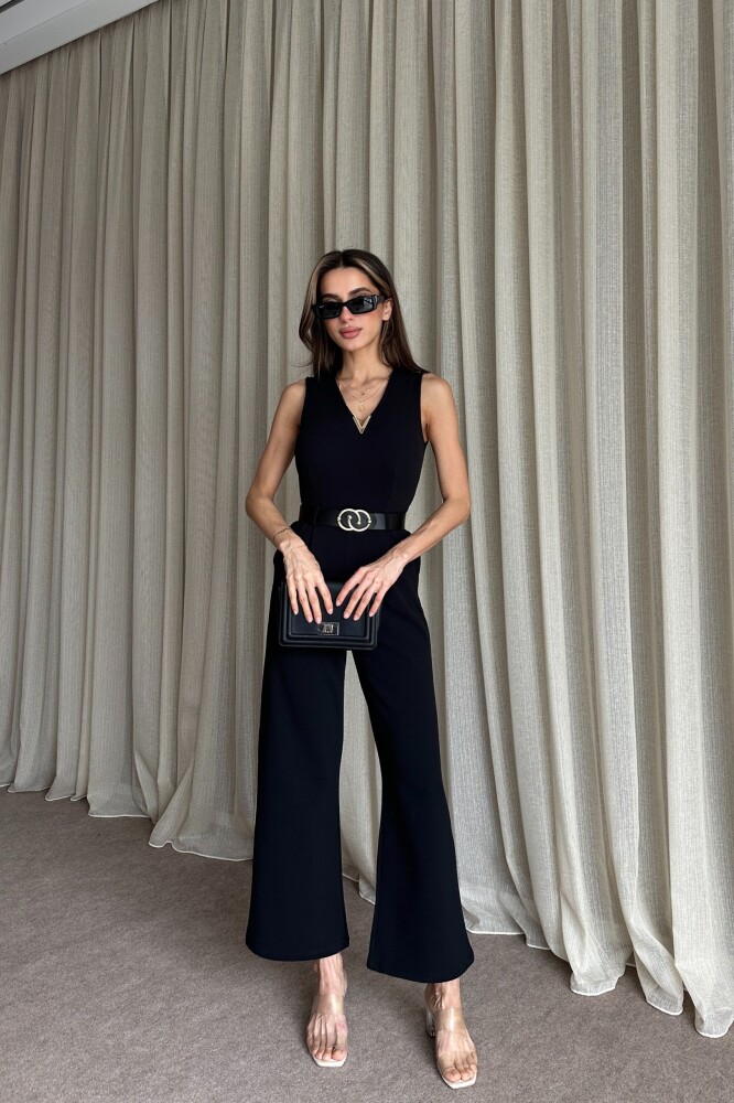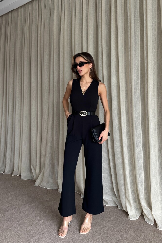 V yaka Önü Aksesuar Detaylı Kemerli Tulum - Siyah