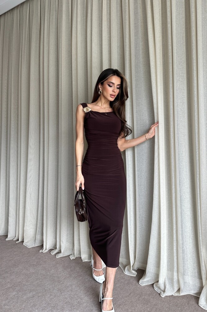 Yanları büzgülü, omuz tokalı, uzun.Kumaş - İçerik Bilgisi