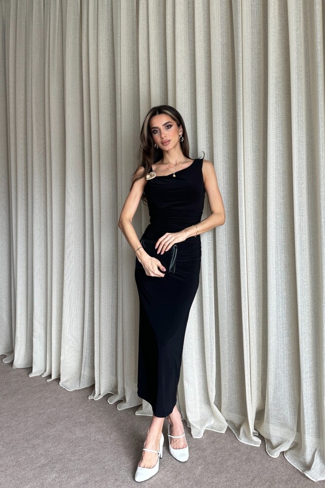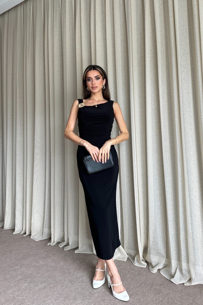 Yanları Büzgülü Omuz Toka Detaylı Uzun Elbise - Siyah